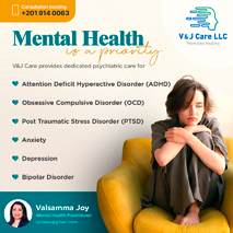 V&J Care LLC is a compassionate space dedicated to supporting individuals on their journey towards mental wellness and psychiatric services. Offering psychiatric evaluations and personalized treatment plans, we prioritize a holistic approach. Our goal is to create a nurturing and supportive environment where patients feel heard, understood and empowered for mental health resilience and overall well-being.